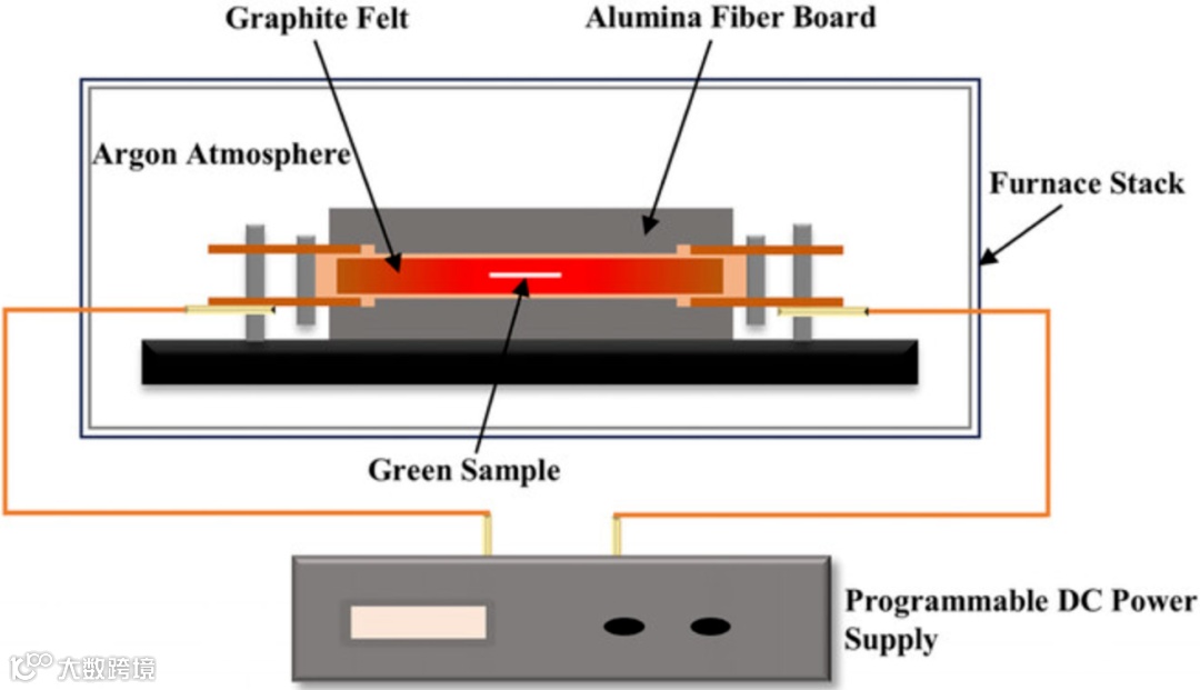 先看图1。这套UHS装置是自己搭的:石墨毡做加热元件,高频脉冲电流一过,焦耳热瞬间起来,靠传导和辐射把生坯加热到烧结温度。原理不复杂,但关键在“超快”——升温速率快到传统炉子根本追不上。