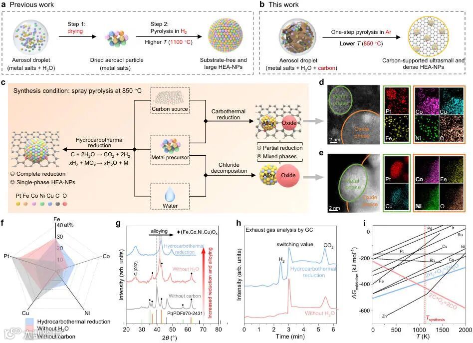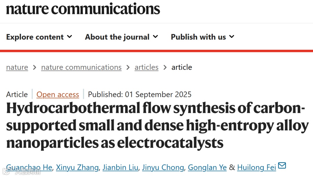 高熵合金纳米颗粒(HEA-NPs)在催化与能源转换领域展现出巨大潜力,但其合成一直面临难以兼顾小尺寸与高负载量的技术挑战。2025年9月1日,湖南大学费慧龙团队在Nature Communications上发表创新研究成果,开发出一种基于连续流动喷雾热解的新型合成策略,成功实现了尺寸小于2 nm、金属负载量达30 wt%的高熵合金纳米颗粒的规模化制备,为高性能电催化剂的设计与合成提供了新方案。