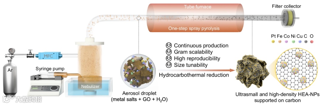 该技术通过雾化含金属盐和氧化石墨烯的前驱体溶液,在氩气载流下通过预热管式炉,最终实现高熵合金纳米颗粒的连续化制备。