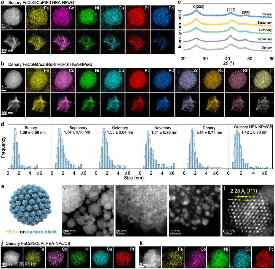 六元和十元HEA-NPs的EDS元素分布图证明了该策略对多组分体系的适用性,不同组元HEA-NPs的XRD图谱显示均形成单一固溶体相,炭黑载体上的表征进一步展示了底材适应性。