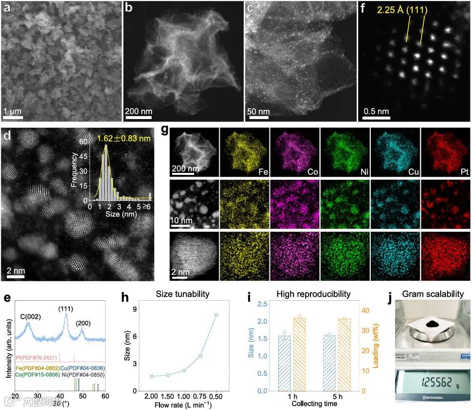 图2对五元FeCoNiCuPt HEA-NPs进行了系统的结构与成分表征。