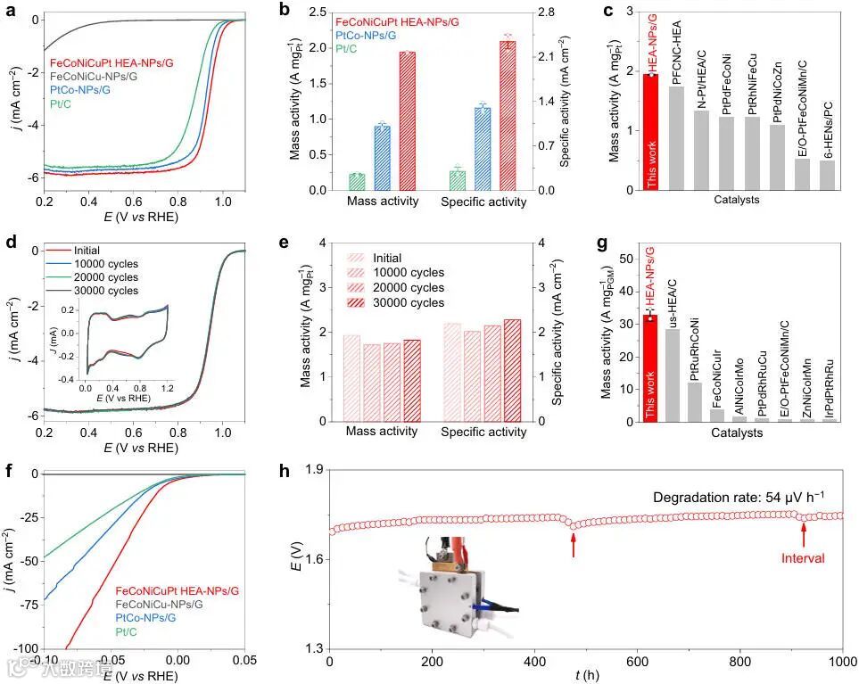 优异催化性能:FeCoNiCuPt HEA在ORR和HER反应中质量活性显著优于商用铂碳