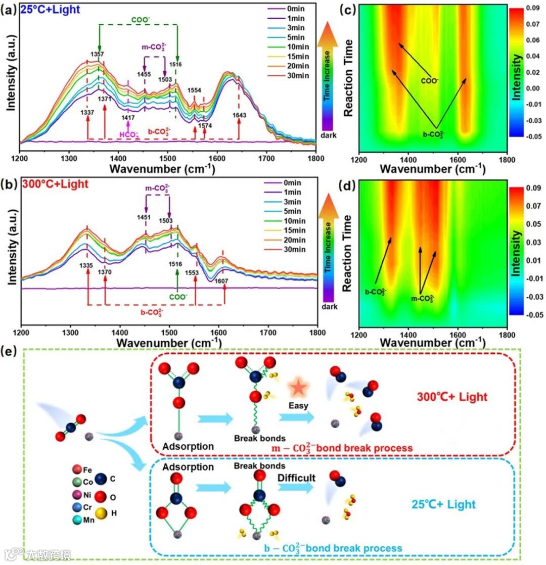 图4的原位红外漫反射光谱揭示了反应中间体与温度依赖的转化路径。