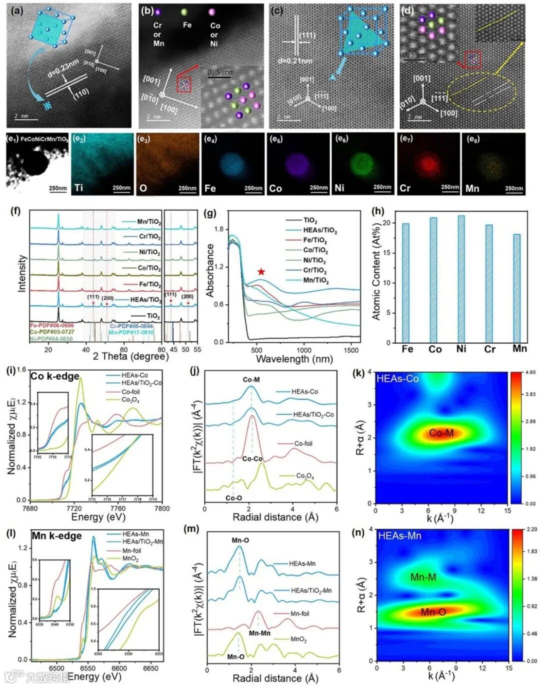 通过HRTEM和HAADF图像(图2a-d)清晰展示了FeCoNiCrMn高熵合金的边缘与中心结构特征。图2e₁-e₈的元素分布图证实了HEAs/TiO₂中各元素的均匀分散。XRD图谱(图2f)与紫外-可见吸收光谱(图2g)揭示了材料的晶体结构与光学特性。ICP-OES分析(图2h)与XANES、EXAFS谱图(图2i-n)从电子结构层面阐释了催化活性起源。