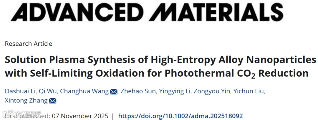 面对全球碳中和目标与CO₂转化技术瓶颈,东北师范大学王长华、张昕彤团队在材料学顶刊《Advanced Materials》上发表创新研究成果。团队开发了溶液等离子体放电技术,首次在常温常压的水相环境中,将非贵金属高熵合金纳米颗粒高效合成与CO₂催化转化合二为一。该技术使FeCoNiCrMn高熵合金催化剂在光热CO₂还原中实现298.1 mmol/gHEA/h的CO生成速率,较单金属催化剂提升6-13倍,且具备100%选择性,为高熵合金绿色制造与碳资源化提供了全新的解决方案。