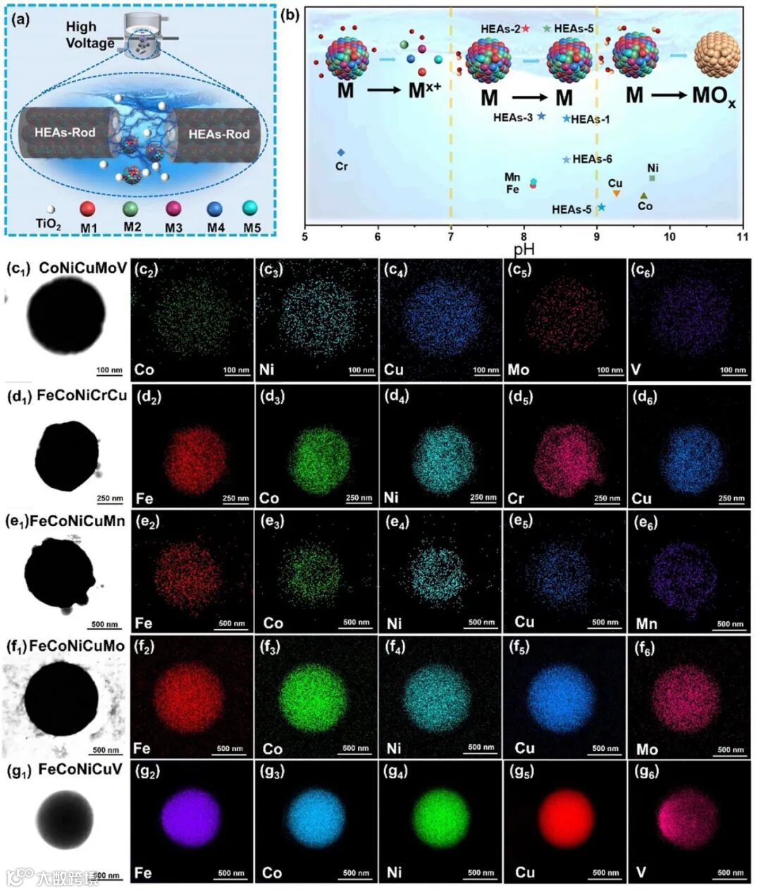 图1a展示溶液等离子体合成HEAs/TiO₂示意图,揭示了常温常压下高熵合金的形成路径。图1b通过电导率与pH对比,验证了不同电极组合的放电效果。图1c₁-g₆系统呈现了CoNiCuMoV、FeCoNiCrCu、FeCoNiCuMn、FeCoNiCuMo、FeCoNiCuV等五种高熵合金体系的元素分布图,证实了多元素在纳米尺度上的均匀分布。