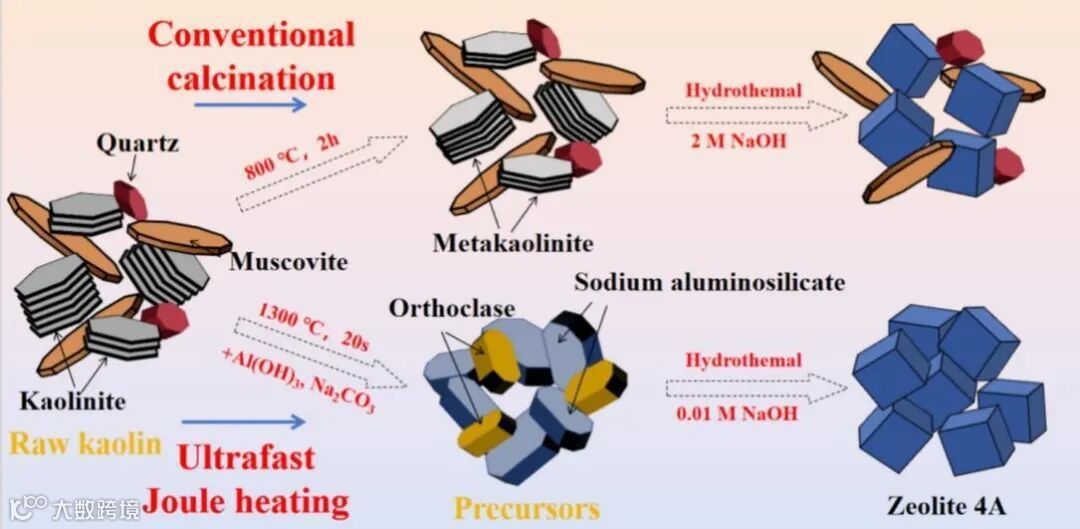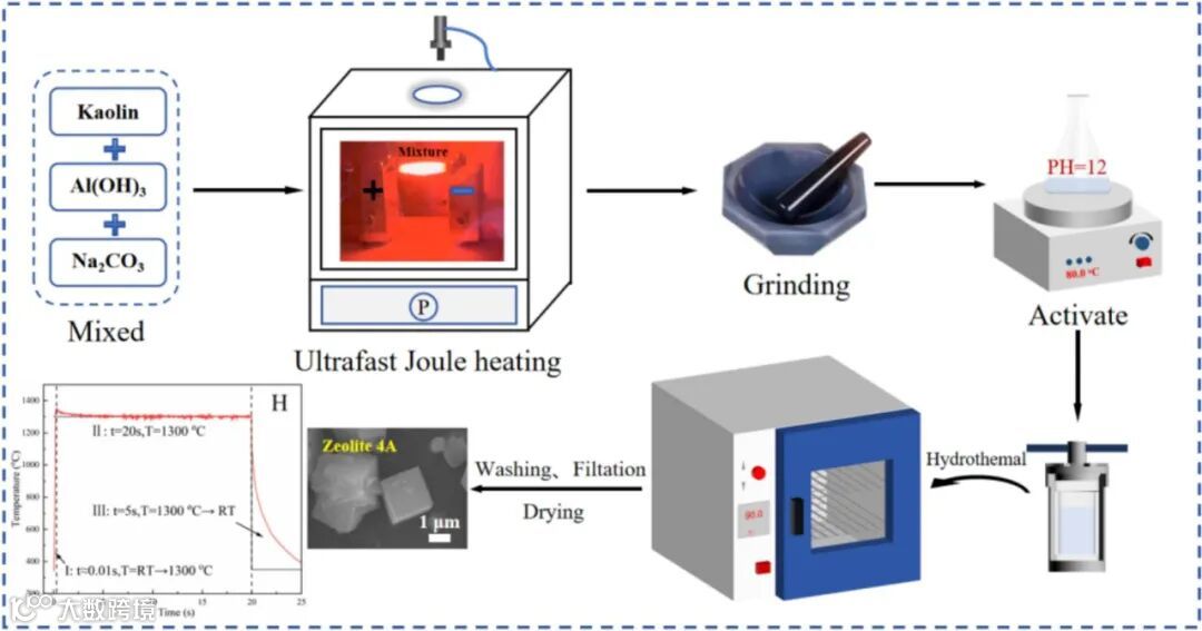 超快焦耳加热路线实现低品位高岭土秒级合成沸石 4A。将高岭土与 Al(OH)₃、Na₂CO₃ 混合后,1300°C 闪速加热 20 秒,再经 90°C、10 小时水热结晶定向转化。
