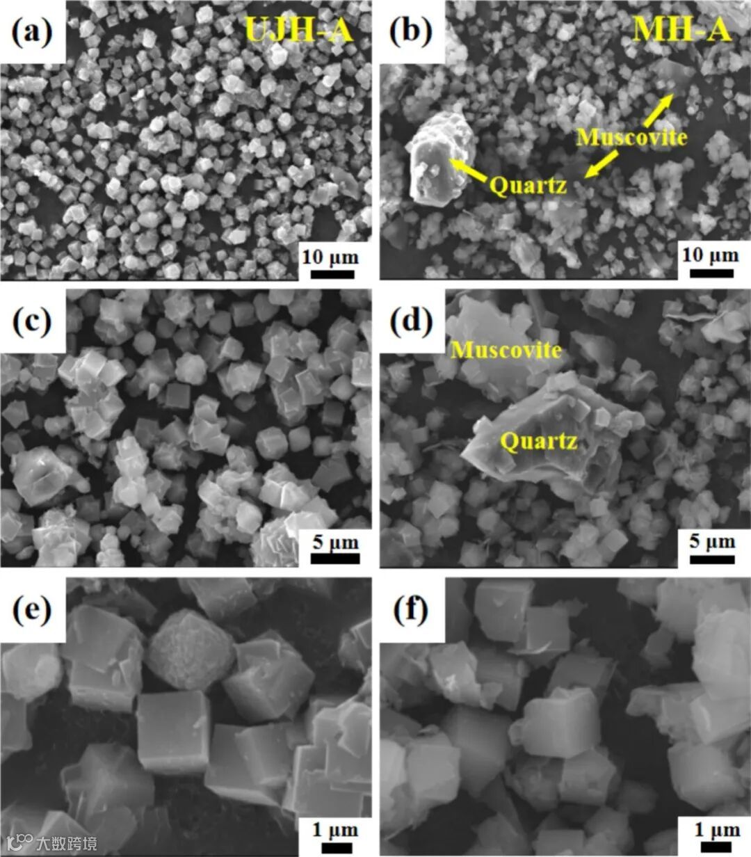 SEM 分析 :SEM 形貌图中,UJH 产物呈现均一立方沸石晶体,尺寸均匀,形态规则;而传统法产物可见板状白云母和棱柱状石英嵌入沸石基体,从微观形貌证实 UJH 技术消解杂质能力。