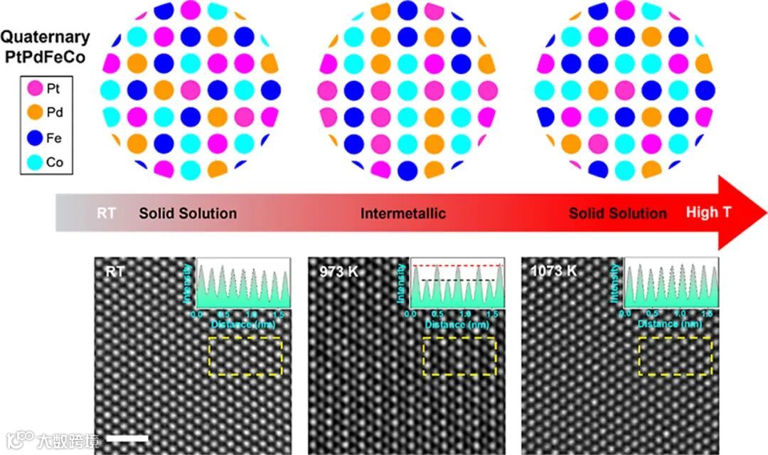 图1:展示了PtPdFeCo多元素合金纳米颗粒在高温条件下的相变过程,揭示了高温对合金微观结构的动态影响。