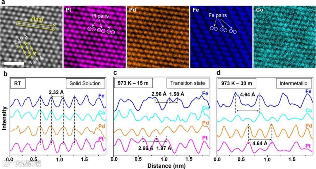 原子级结构分析:通过实验和理论相结合的方法,系统研究了四元PtPdFeCo多元素合金纳米颗粒在高温下的动态相变行为。