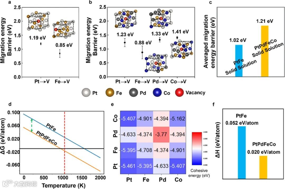 图4:基于密度泛函理论(DFT)计算,展示了PtFe和PtPdFeCo合金在相变过程中的元素迁移能、吉布斯自由能变化及键能差异。