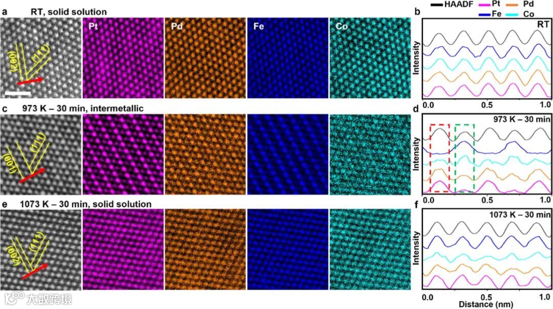 “无序-有序-无序”相变:观察到PtPdFeCo合金在973 K时从无序固溶体转变为有序的L10金属间化合物,并在进一步加热至1073 K时恢复为固溶体。