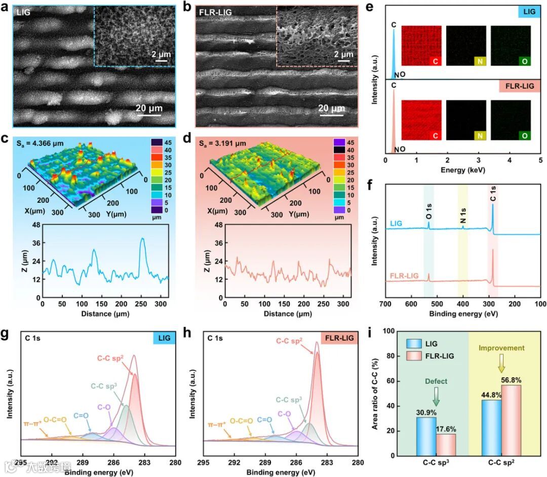 飞秒激光处理对 LIG 的微纳结构与化学状态带来了深刻改变。SEM 图像直观地显示出,原始 LIG 表面是微米级带状絮状结构,覆盖着纳米颗粒,而经过 FLR-LIG 处理后,表面呈现出清晰的沟槽结构,并且均匀分布着纳米孔,粗糙度 Sa 从 4.336µm 降至 3.191µm。EDS 与 XPS 分析结果表明,FLR-LIG 中氮元素几乎完全脱除,碳含量显著提升。C 1s 精细谱拟合进一步显示,sp²杂化碳比例从 44.8% 增至 56.8%,而与缺陷相关的 sp³杂化碳比例则从 30.9% 降至 17.6%,充分证实飞秒激光通过碳原子重排有效降低了缺陷密度。表面氧含量的轻微上升可能是由于空气中高温氧化反应所致。