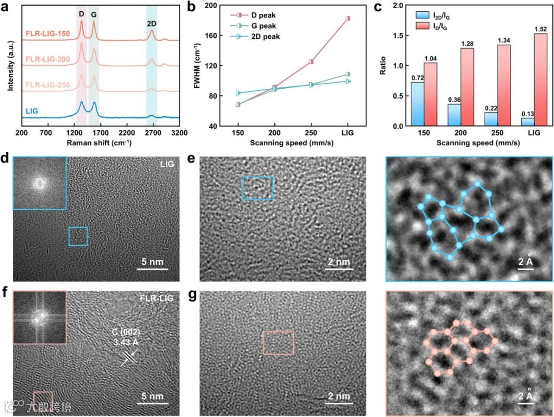 拉曼光谱与透射电镜(Cs-TEM)深入揭示了 FLR-LIG 的原子级结构优化。拉曼 D 峰半峰宽降低,ID/IG 从 1.52 降至 1.04,I2D/IG 从 0.13 增至 0.72,这些数据有力地表明缺陷密度下降,石墨化程度显著提升,晶粒尺寸 La 从 12.6nm 增至 18.5nm。原子分辨率 TEM 图像更是清晰地显示出,原始 LIG 以非晶结构为主,包含五元 / 七元环等缺陷,而 FLR-LIG 则呈现出规整的六元碳环排列,层间距≈3.43Å,并且拥有清晰的平面石墨烯结构,FFT 衍射斑点对称性也得到了明显提升,充分证实飞秒激光实现了缺陷的动态修复。