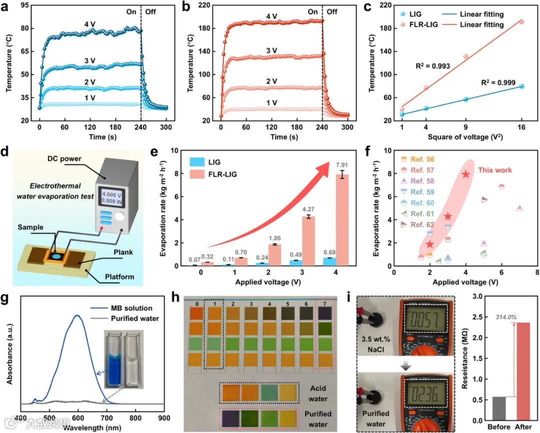 FLR-LIG 的高导电性与超亲水性(接触角≈4.0°)赋予其卓越的电热转换能力。在 4V 电压下,其表面温度可达 191.1°C,远高于原始 LIG 的 79.7°C,完美符合焦耳定律所描述的温度与电压平方的线性相关关系。基于此构建的电热蒸发系统,在 4V 电压下实现了 7.91kg・m⁻²・h⁻¹的蒸发速率,较原始 LIG 提升了 10 倍,并且优于同类报道。在环境修复领域,FLR-LIG 表现出巨大的应用潜力,可高效净化染料废水(MB/RhB 脱色率 >99%)、强酸 / 碱废水(pH≈7)及模拟海水(电阻从 0.57MΩ升至 2.36MΩ)。