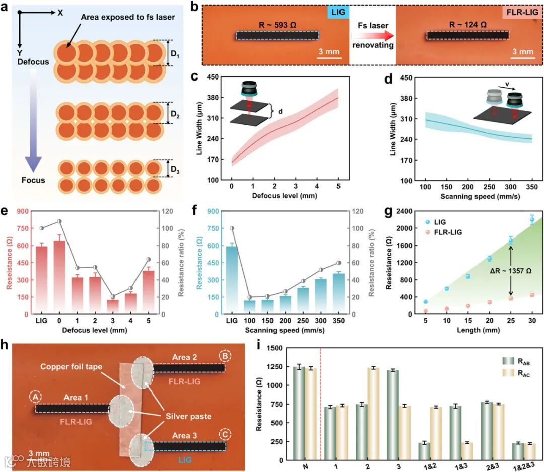 通过精准调控离焦量(0-5mm)和扫描速度(100-350mm/s),实现了对 FLR-LIG 性能的精确调控。当离焦量为 3mm、扫描速度为 150mm/s 时,电阻降至最低值 118Ω,片电阻也从 98Ω/sq 降至 20Ω/sq。离焦量和扫描速度的过大或过小都会导致局部烧蚀或能量密度不足等问题。飞秒激光单次扫描即可完成高效修复,优于需要多次辐照的 CO₂激光法。此外,选择性修复成功设计出分叉电路,验证了图案化加工的可行性,这为石墨烯材料在复杂电子器件中的应用提供了关键技术支持。