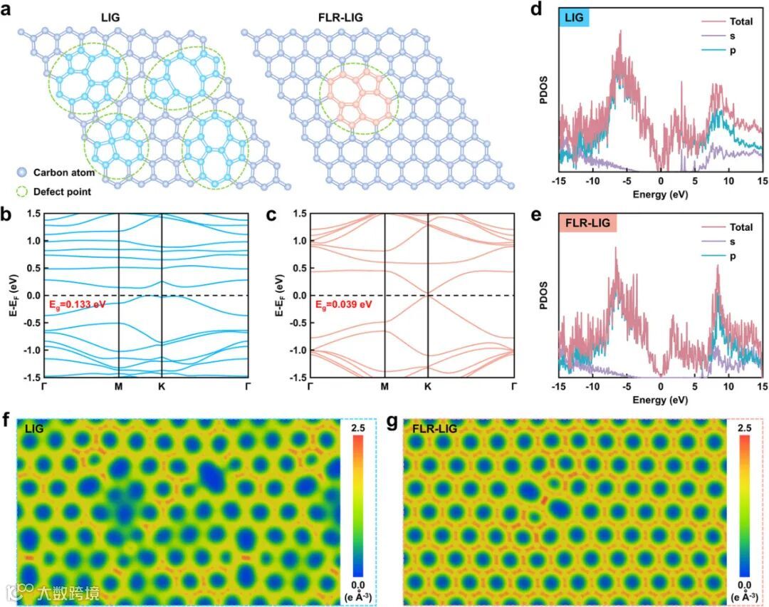 密度泛函理论(DFT)计算为 FLR-LIG 的优异性能提供了理论支撑。计算结果显示,缺陷修复显著优化了 LIG 的电子结构,原始 LIG 因高缺陷密度形成带隙≈0.133eV,而 FLR-LIG 带隙缩窄至 0.039eV,接近理想石墨烯的零带隙特性。部分态密度(PDOS)分析表明,FLR-LIG 的费米能级附近 p 电子态密度显著增加,并且能带在布里渊区 K 点附近呈现出线性色散关系,载流子迁移率得以提升。电子密度分布模拟进一步揭示,FLR-LIG 的电荷分布更加均匀,减少了载流子散射,从而为电阻从 593Ω降至 118Ω提供了坚实的理论依据。