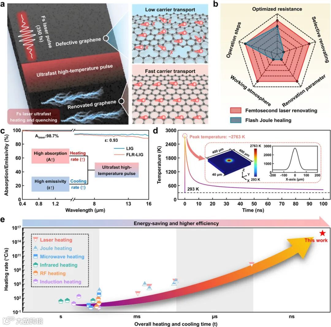 飞秒激光修复技术(FLR-LIG)凭借超短脉冲(350fs)激发的瞬时高温(≈2763K)与急速冷却(100ns 内降温)效应,精准驱动 LIG 缺陷处碳原子的动态重排。相较于传统闪速焦耳加热法,它无需真空环境,还能实现选择性修复,线宽可控,且与样品尺寸无关。LIG 的高吸收率(≈98.7%)、高红外发射率(≈0.93)以及低比热容特性,使其在飞秒激光辐照下展现出极快的升降温速率(10¹²K/s)。COMSOL 模拟清晰地呈现出单脉冲辐照后,表面温度在 350fs 内迅速升至 2763K,随后快速冷却,这种独特的热力学条件为缺陷修复提供了理想环境。与其他热加工技术对比,FLR-LIG 在升温速率和总处理时间上均表现出显著优越性,为原子级结构调控创造了得天独厚的条件。