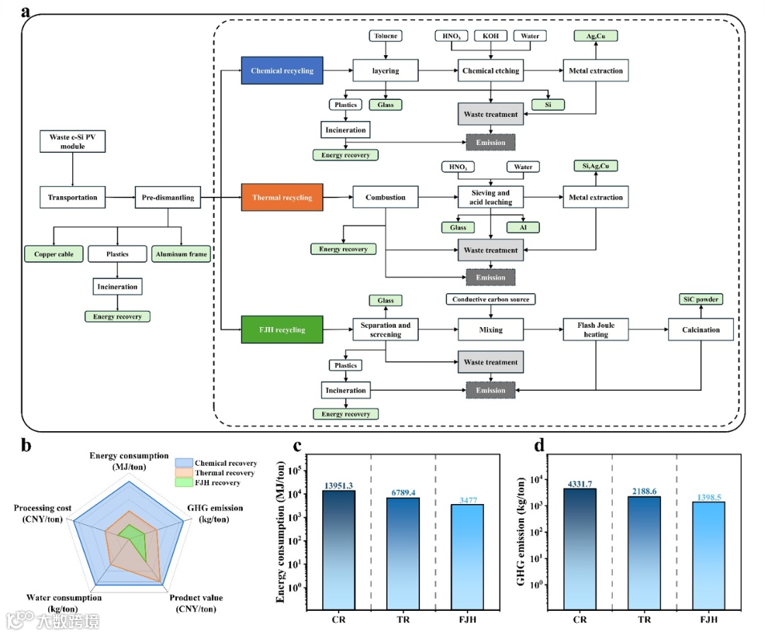 当 2050 年全球光伏装机冲击 4500 GW,8000 万吨退役组件正排队等待“重生”。传统回收像老牛拉车——又慢又费料。南师大姜小祥团队干脆给废晶硅来了一记“闪电鞭”:毫秒级焦耳热闪蒸,直接把硅片炼成 96 % 纯碳化硅“黑钻”,能耗砍半、碳排打骨折,连贵金属 Ag、Al 都被瞬间蒸发回收。