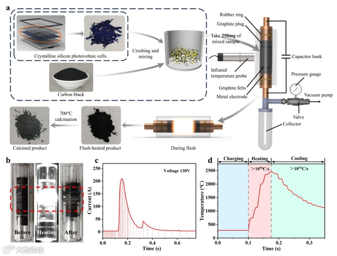 把废电池片打成粉,掺点炭黑,塞进石英管——啪! 130 V 电火花让它瞬间飙到 2200 °C,又在毫秒间冷却。