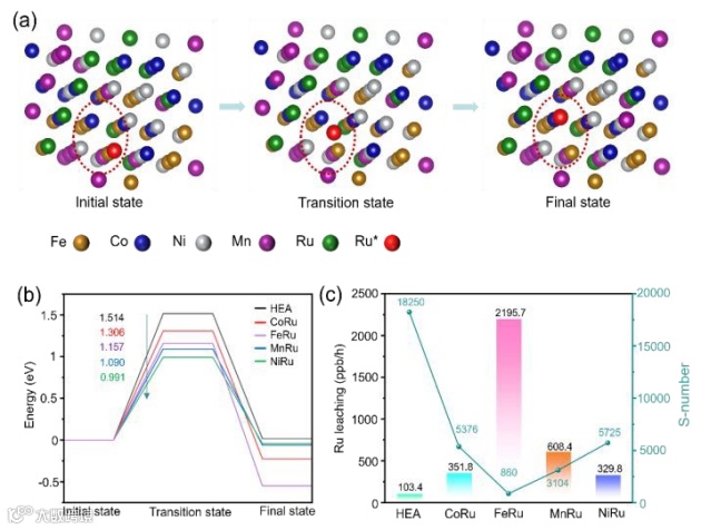 晶格畸变使Ru原子迁移能垒提升至1.51 eV(传统合金仅1.09 eV),抑制溶解。