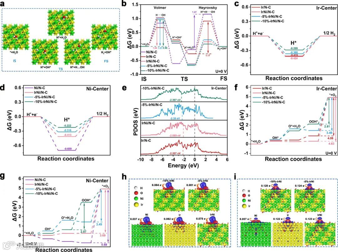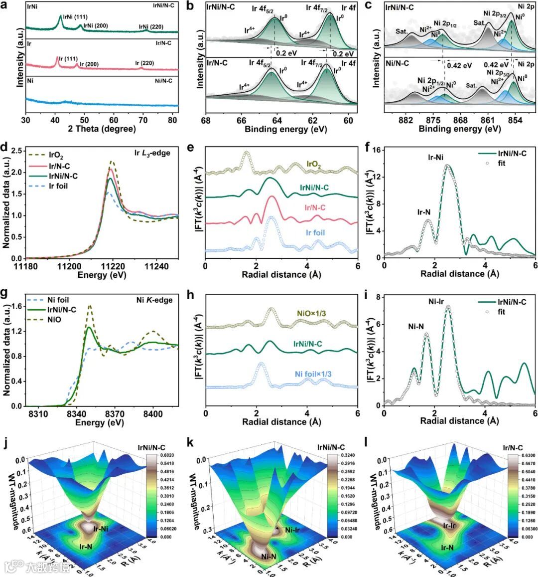 X射线衍射(XRD)和X射线光电子能谱(XPS)分析表明,IrNi/N–C的晶格参数因Ni的插入而收缩,Ir和Ni之间存在显著的电子转移,Ir的价态降低,Ni的价态升高。这种电子重新分布优化了催化剂的表面电子性质,增强了对反应中间体的吸附能力,从而提高了催化效率。