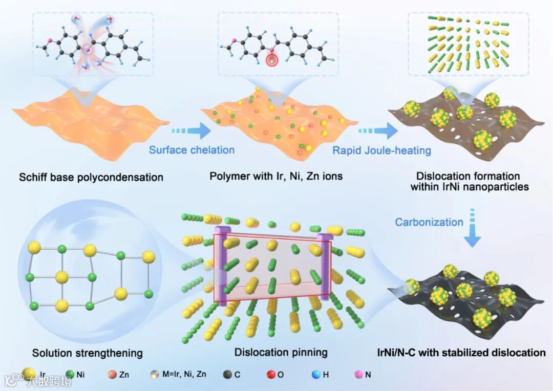 图1展示了IrNi/N–C催化剂的制备过程及其位错形成机制。研究团队通过Schiff碱的脱水缩合反应合成氮掺杂的有机聚合物碳载体,并在其表面螯合Ir和Ni金属前驱体及过量的Zn。在非平衡超快热冲击条件下,通过焦耳加热在3–5秒内将温度迅速提升至1500°C,诱导Zn升华并形成空腔,同时产生晶格空位。这些空位被Ir和Ni原子占据,通过晶格攀爬机制引发位错的形成。随后,通过高温固溶强化处理,进一步稳定了位错结构,优化了催化剂的电子性能。