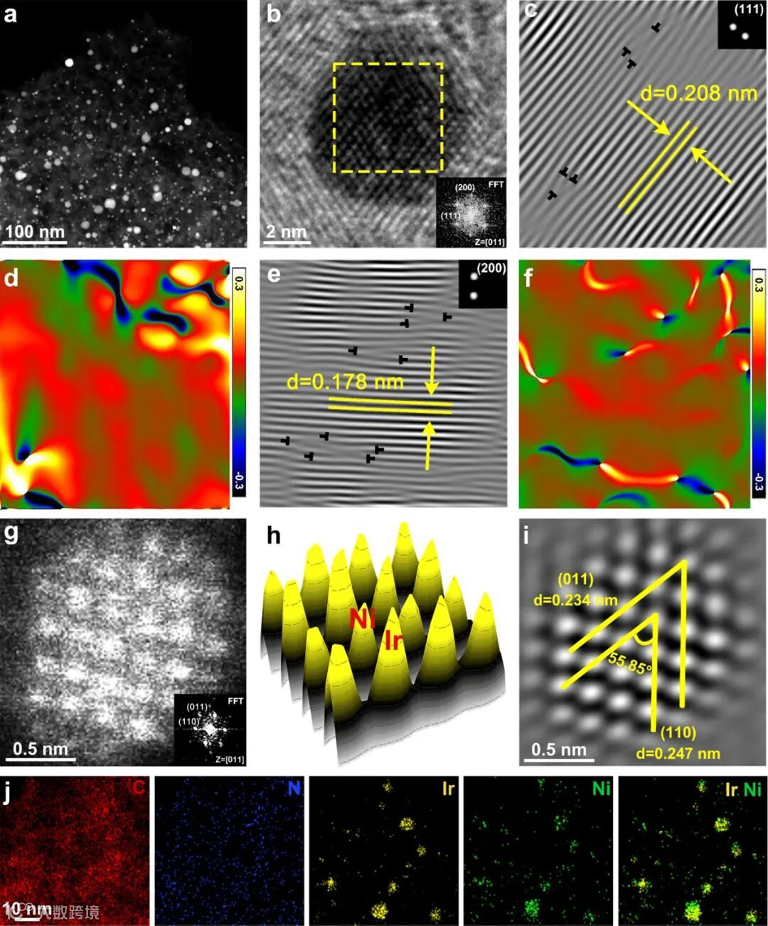 透射电子显微镜(TEM)图像显示,IrNi纳米颗粒均匀分散在氮掺杂的碳载体上,平均粒径为5–7纳米。高分辨TEM(HRTEM)揭示了丰富的Frank部分位错,导致晶格压缩,(111)晶面的晶格间距压缩至0.208纳米,比标准IrNi合金小3.25%。几何相分析(GPA)进一步证实了位错引起的压缩应变效应,优化了催化剂的电子结构和催化活性。