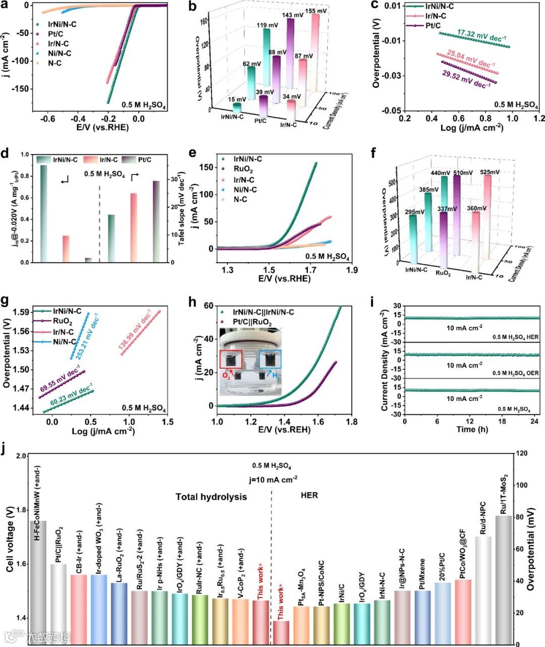 显著提升的催化性能:优化后的IrNi/N–C催化剂在酸性和碱性条件下展现出卓越的水分解性能,远超商业Pt/C||RuO₂催化剂。