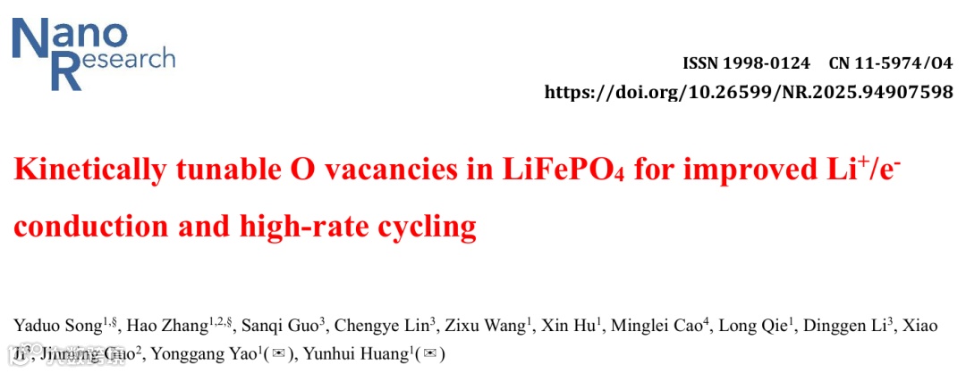 标题:Kinetically tunable O vacancies in LiFePO4 for improved Li+/e- conduction and high-rate cycling -