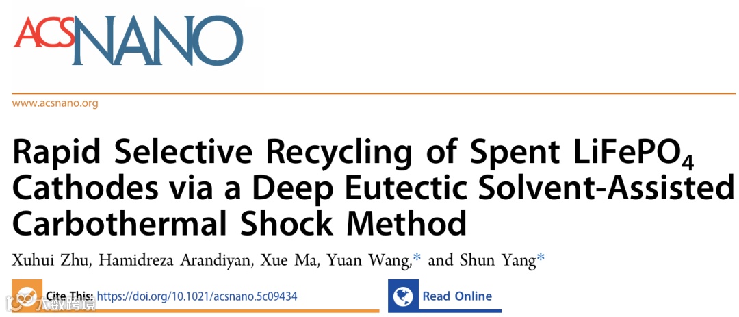 面对废旧磷酸铁锂正极稳定难解、传统回收工艺高能耗低效率的行业瓶颈,江苏师范大学杨舜团队与墨尔本大学王媛团队在《ACS Nano》上发表突破性研究成果。研究团队创新性地提出低共熔溶剂辅助碳热冲击策略,在20秒内将废旧磷酸铁锂高效转化为高附加值产物,实现锂回收率97.39%,并成功将回收产物用于催化废弃塑料转化,为锂电资源循环与塑料污染治理提供了全新的协同解决方案。