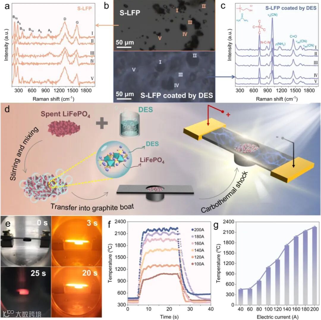图1 通过拉曼光谱与共聚焦显微镜证实,低共熔溶剂均匀包覆磷酸铁锂颗粒,为后续瞬时反应奠定基础;温度曲线显示系统可在4秒内升至2100℃,展现超快加热能力。