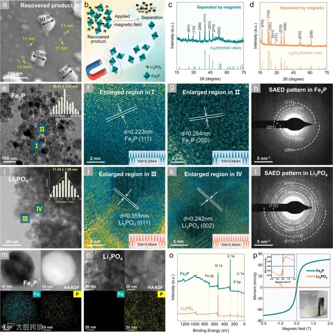 图3 对回收产物的形貌与结构表征显示,Fe₂P与Li₃PO₄分别形成50nm和11nm的均匀颗粒,且元素分布清晰无交叉;Fe₂P的强铁磁性为后续磁选分离提供便利。