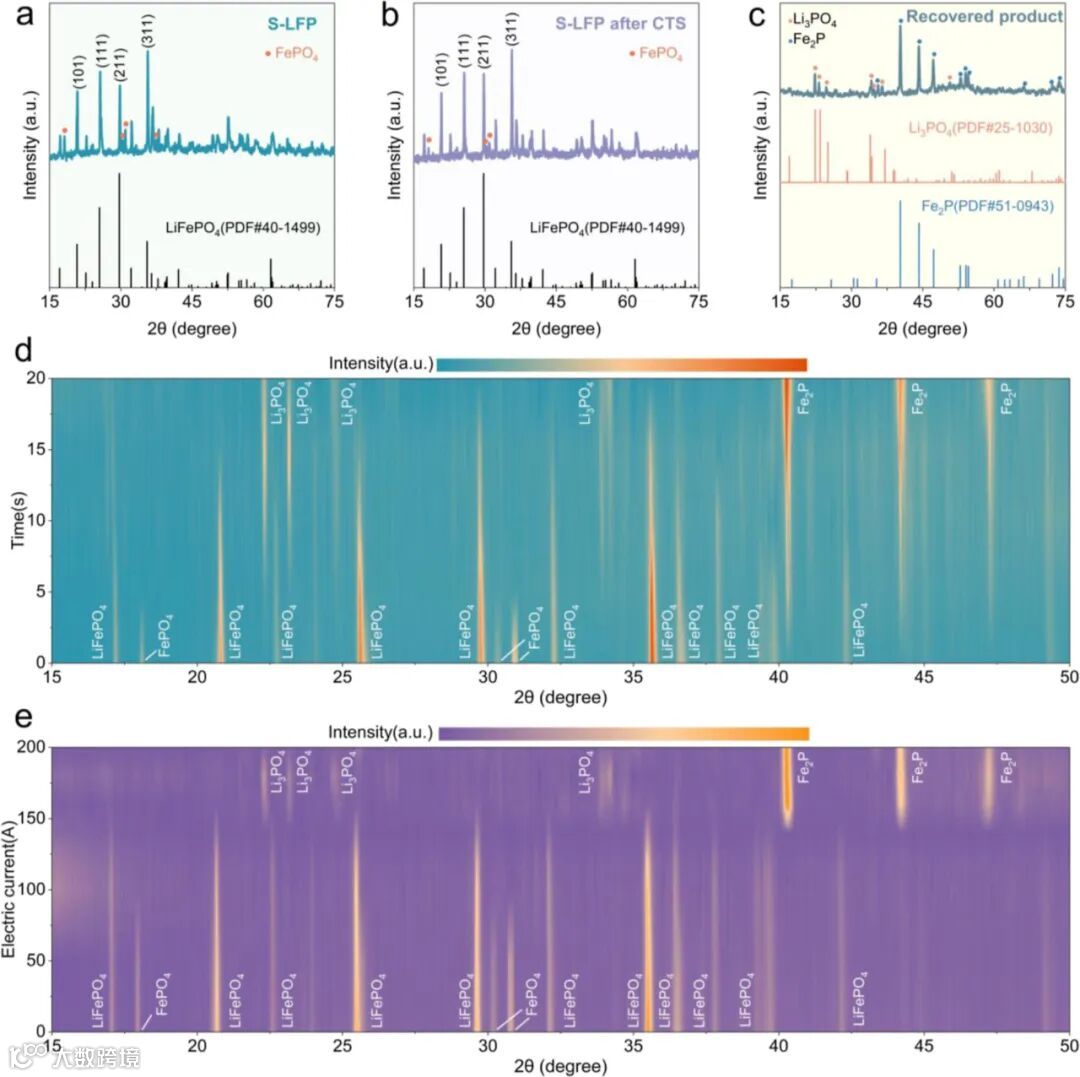 图2 的XRD结果表明,低共熔溶剂包覆是实现磷酸铁锂完全转化为Fe₂P与Li₃PO₄的关键,最优条件为180A电流作用20秒,突显该方法在快速完全相转化方面的独特优势。