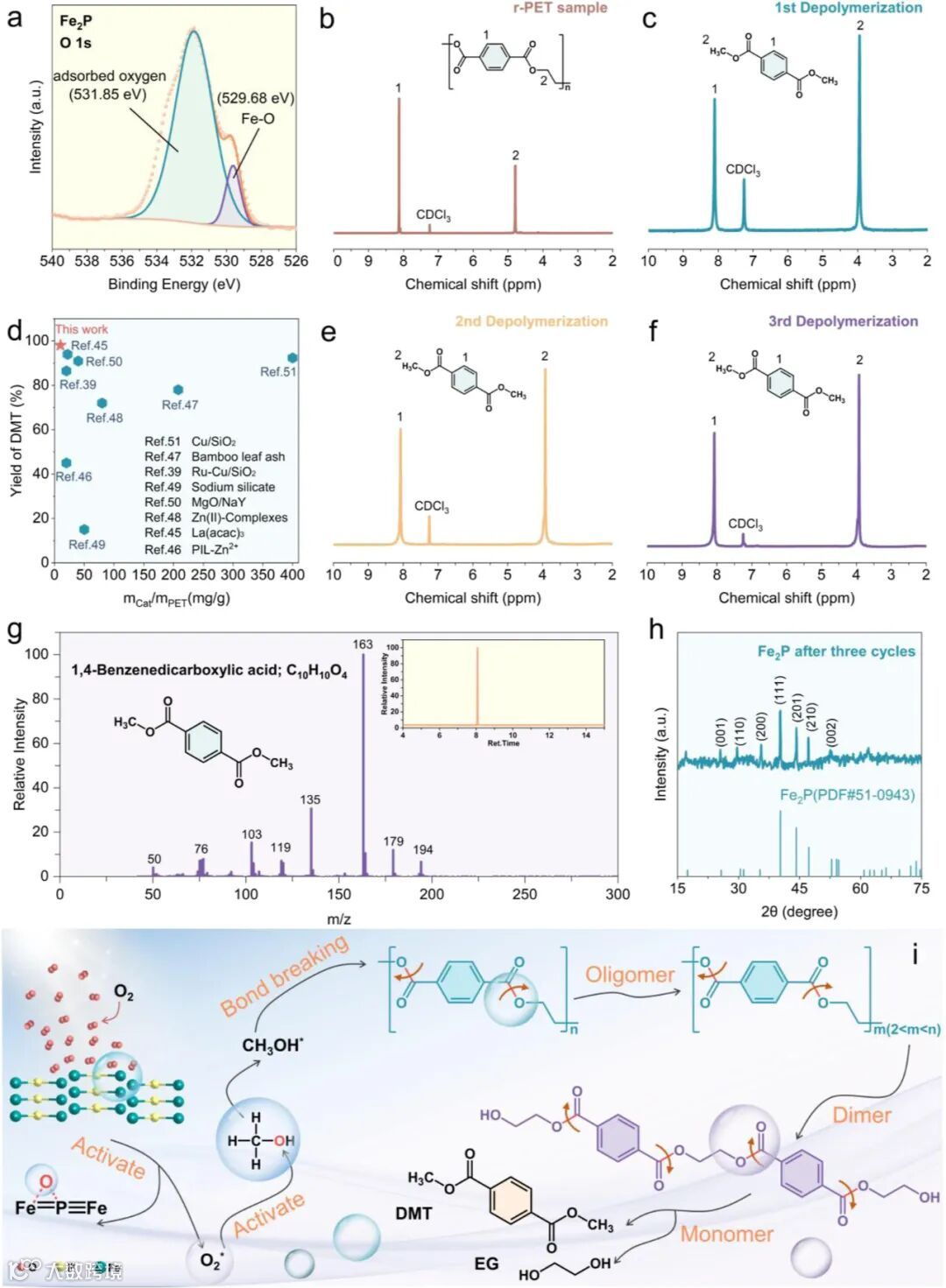 图5 系统评估了Fe₂P在废弃PET解聚中的催化性能,其催化生成的DMT单体产率高达98.05%,且循环三次后仍保持优异活性,实现“电池-塑料”废弃物的协同资源化。