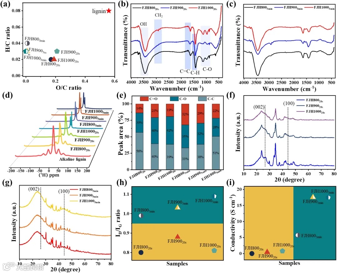 图3揭示了热解温度和时间对生物炭结构的影响。研究表明,高温和延长停留时间显著提高了生物炭的芳香性和石墨化程度,同时提升了电导率,为其在储能材料中的应用提供了可能性。