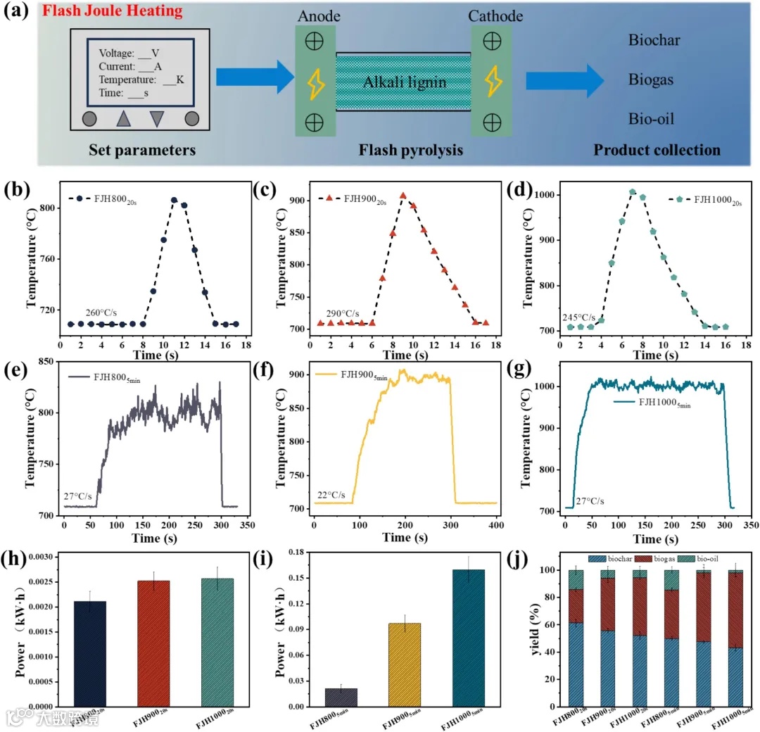 图1展示了闪蒸焦耳热技术的实验流程与产物变化情况。高加热速率(245至290°C/s)显著降低了能耗,并在短时间内完成了热解过程。三相产物分析表明,随着停留时间和温度的增加,气相产物比例大幅提升,而液相产物比例显著下降。
