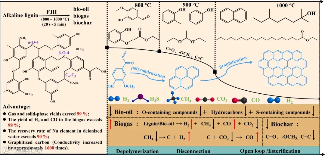 高效转化:研究在800至1000°C范围内探索了碱木质素的热解过程,发现气相产物中H₂和CO占比超过98%,而CO₂和CH₄的排放几乎为零。 -