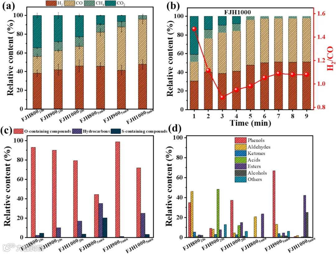 图2显示了不同温度和时间条件下气相产物的变化。高温条件下,CO₂含量趋近于零,而H₂和CO含量持续增加。研究发现,这些变化主要得益于蒸汽重整和焦炭气化反应的加速,为高质量合成气的制备提供了依据。