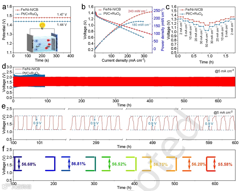 性能卓越:氧还原半波电位达0.907 V,锌空电池稳定运行650小时