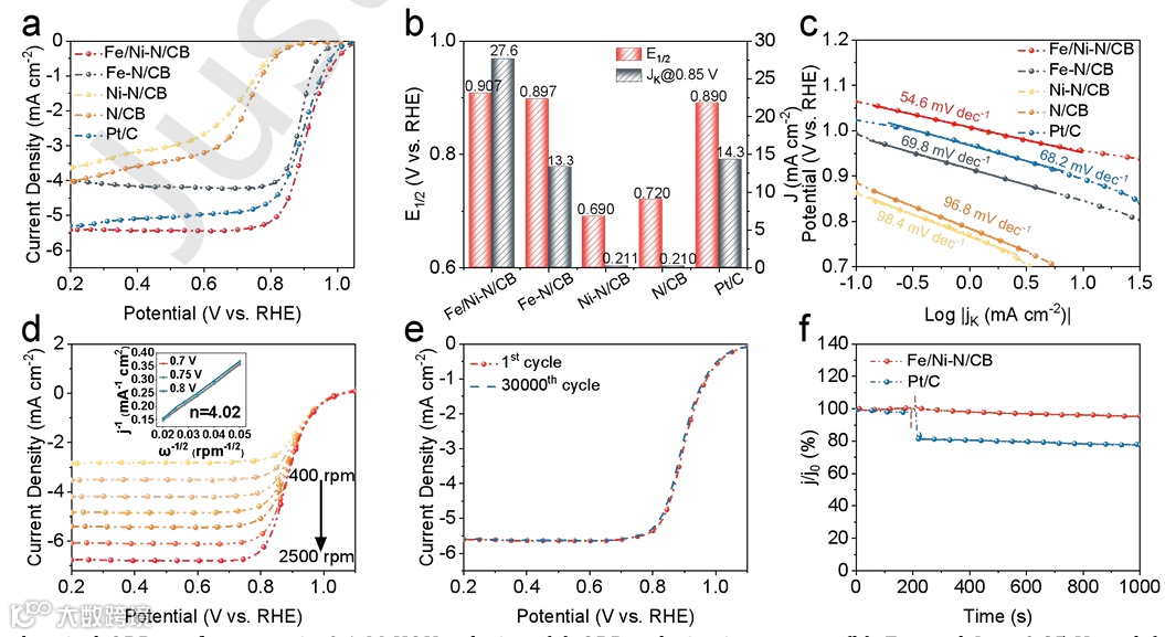 图3 的系统电化学测试表明,Fe/Ni-N/CB具有最优的氧还原活性、稳定性及甲醇耐受性。