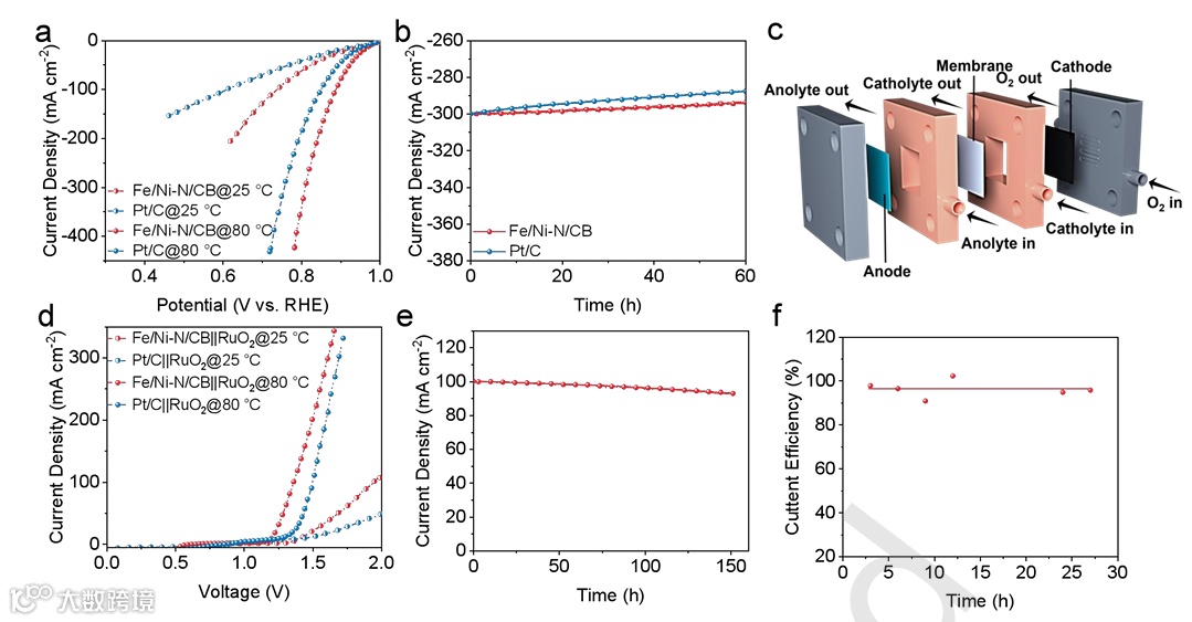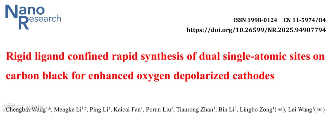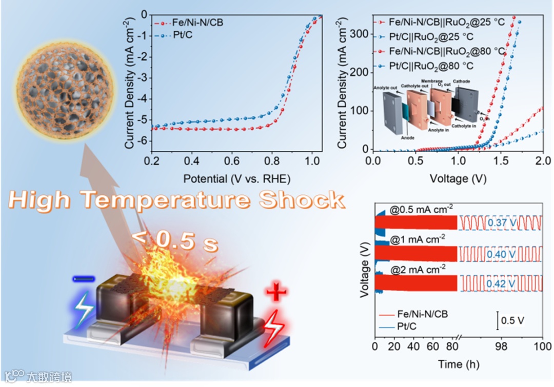 开发兼具高活性与稳定性的非贵金属氧还原催化剂是推动锌空气电池与节能氯碱工业发展的关键。近日,青岛科技大学王磊教授、宗玲博副教授团队在《Nano Research》上发表创新研究成果。团队采用高温冲击合成策略,在0.5秒内成功于商业炭黑上制备出Fe/Ni双单原子催化剂(Fe/Ni-N/CB)。该催化剂在氧还原反应中表现出0.907 V的高半波电位,基于其组装的锌空气电池可稳定循环超过650小时,并在氯碱电解应用中实现300 mA cm⁻²大电流密度下97%的法拉第效率,为高效节能电化学器件的开发提供了新材料。