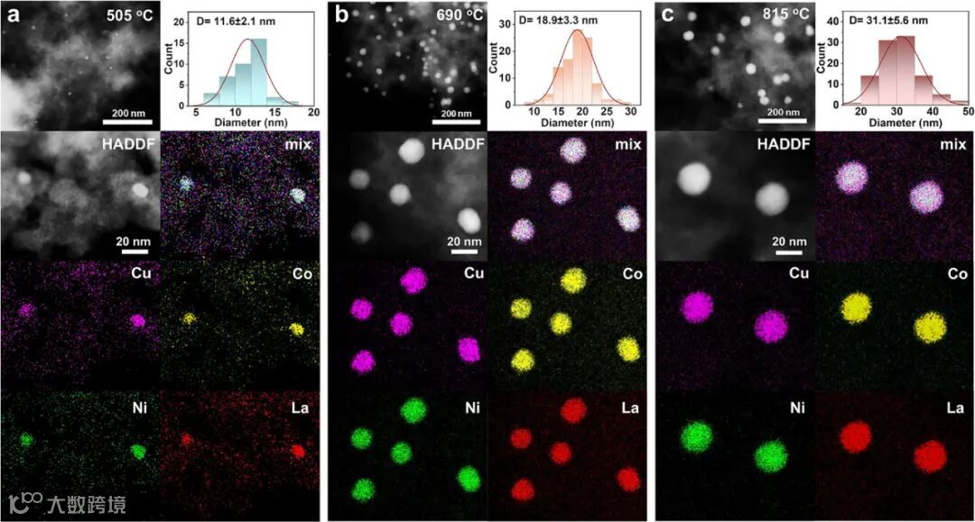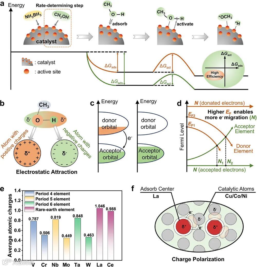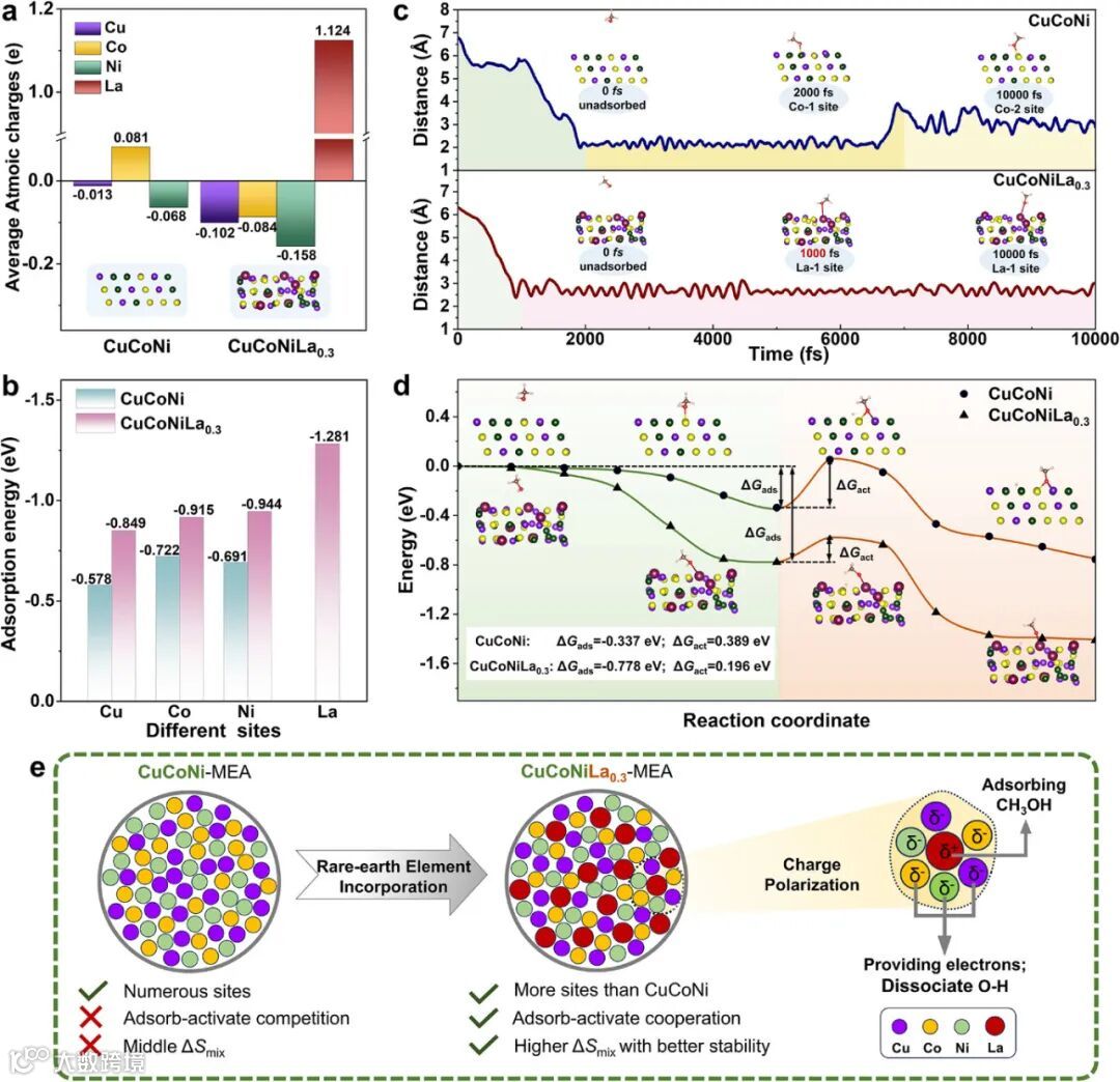 机制创新:La引入诱发电荷极化,形成正电La位点(吸附甲醇) 与负电Cu/Co/Ni位点(解离氢自由基) 的协同活性中心。