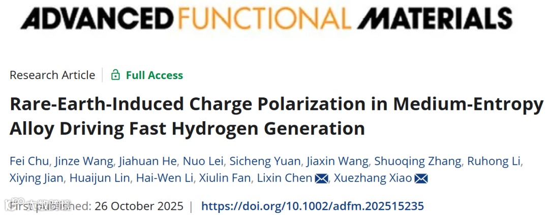 氨硼烷制氢是氢能转化的重要路径,但其反应动力学缓慢制约了实际应用。近日,浙江大学肖学章/陈立新团队在《Advanced Functional Materials》 上发表突破性研究。团队采用碳热冲击法,在2.9秒内成功合成CuCoNiLa/C中熵合金催化剂,并通过稀土诱导电荷极化策略,在原子尺度构建出高效协同的活性位点,使氨硼烷甲醇解的转换频率(TOF)提升至147.9 molH₂ molcat⁻¹ min⁻¹,性能媲美贵金属催化剂。该研究为高效制氢催化剂的理性设计提供了新范式。