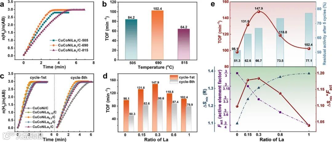 La掺杂量(CuCoNiLa₀.₃/C)与CTS温度(690°C)协同提升TOF,表观活化能降低12.1%。
