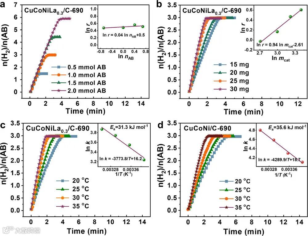 性能卓越:优化后的CuCoNiLa₀.₃/C催化剂在30°C下TOF值达147.9 min⁻¹,表观活化能降低至31.3 kJ·mol⁻¹。