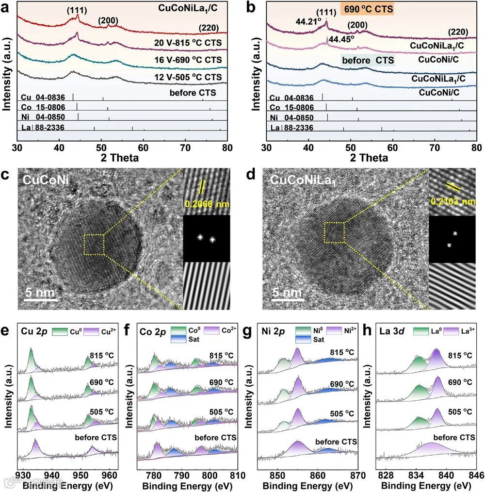 XRD与HRTEM证实La成功融入合金晶格,CTS温度调控实现尺寸精确控制(690°C为最优条件)。
