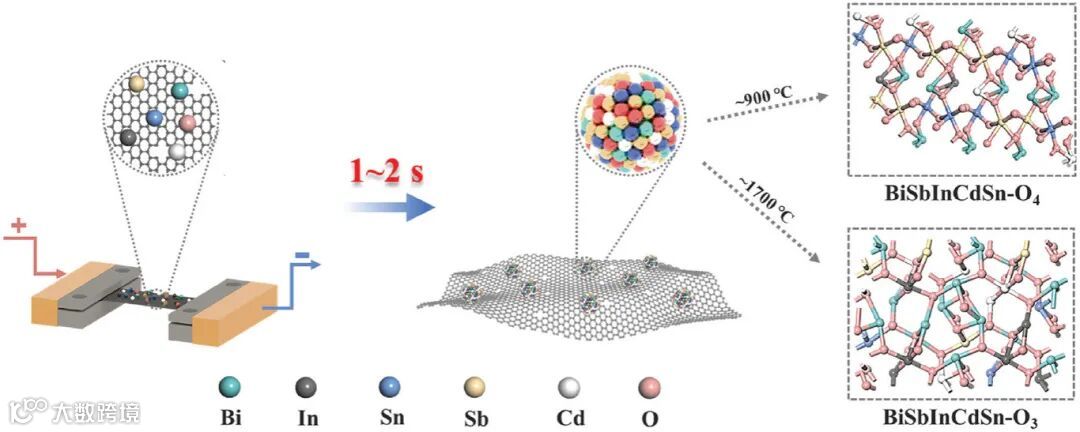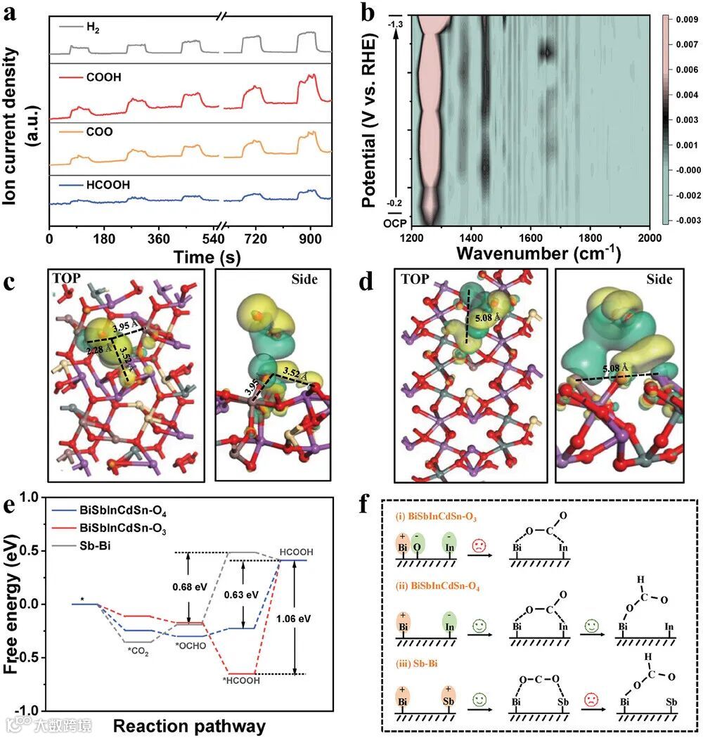 本研究通过快速焦耳加热策略在碳载体上原位负载小于5纳米的高熵氧化物(HEO)纳米粒子,从而提高了活性位点的分散性,增强了电催化性能。BiSbInCdSn-O₄电催化剂在将二氧化碳还原成甲酸的过程中表现出了强大的催化活性,并在152 mA cm⁻²的电流密度下保持了超过100小时的优异稳定性。在膜电极组装(MEA)电解槽中,BiSbInCdSn-O₄电催化剂在3V的电池电压下实现了350 mA cm⁻²的甲酸生成电流密度,并保持了24小时的良好稳定性。 密度泛函理论(DFT)结果揭示了BiSbInCdSn-O₄中长程的Bi和In位点由于电子供体-受体相互作用,有助于二氧化碳的桥接吸附,从而促进了选择性活化和氢化生成甲酸。此外,将电催化CO₂还原(eCO₂RR)与生物质升级在单一电解池中耦合,实现了太阳能到化学能的高效转换,达到了约14.5%的太阳能到燃料的效率。这些发现突出了HEO电催化剂的应用前景,并为根据类似原理增强电催化提供了对HEOs中电子相互作用空间结构的深入见解。