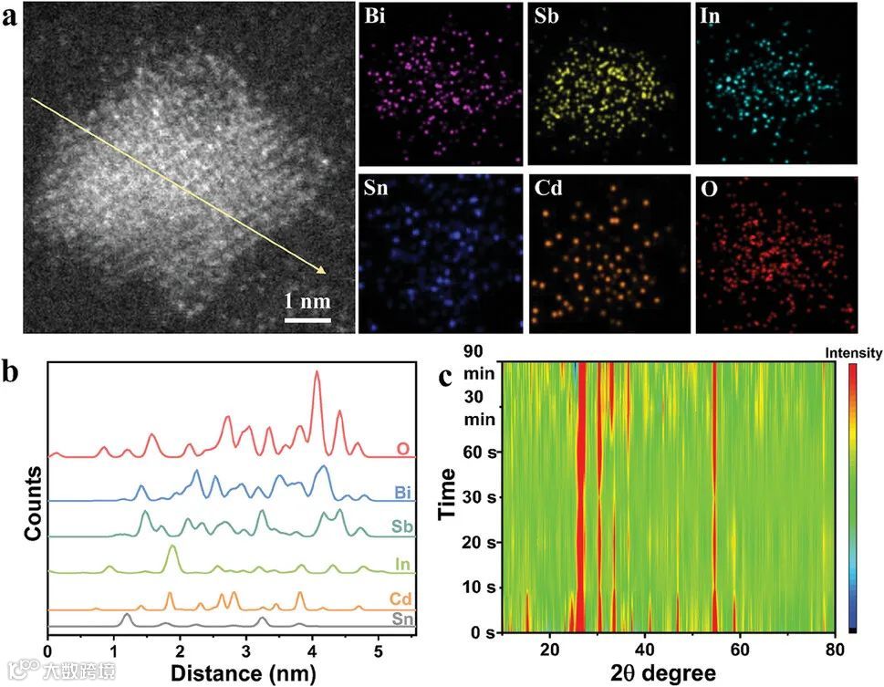 图4a展示了在1 M KOH电解液的流动池中,BiSbInCdSn-O₄电催化剂显著增加了催化系统的电流密度,达到了约150 mA cm⁻²。图4e为在流动池中BiSbInCdSn-O₄在-1.0 V相对于RHE的稳定性测试。在流动池中,BiSbInCdSn-O₄的甲酸法拉第效率可以维持98%长达100小时,表明了其出色的催化和结构稳定性。