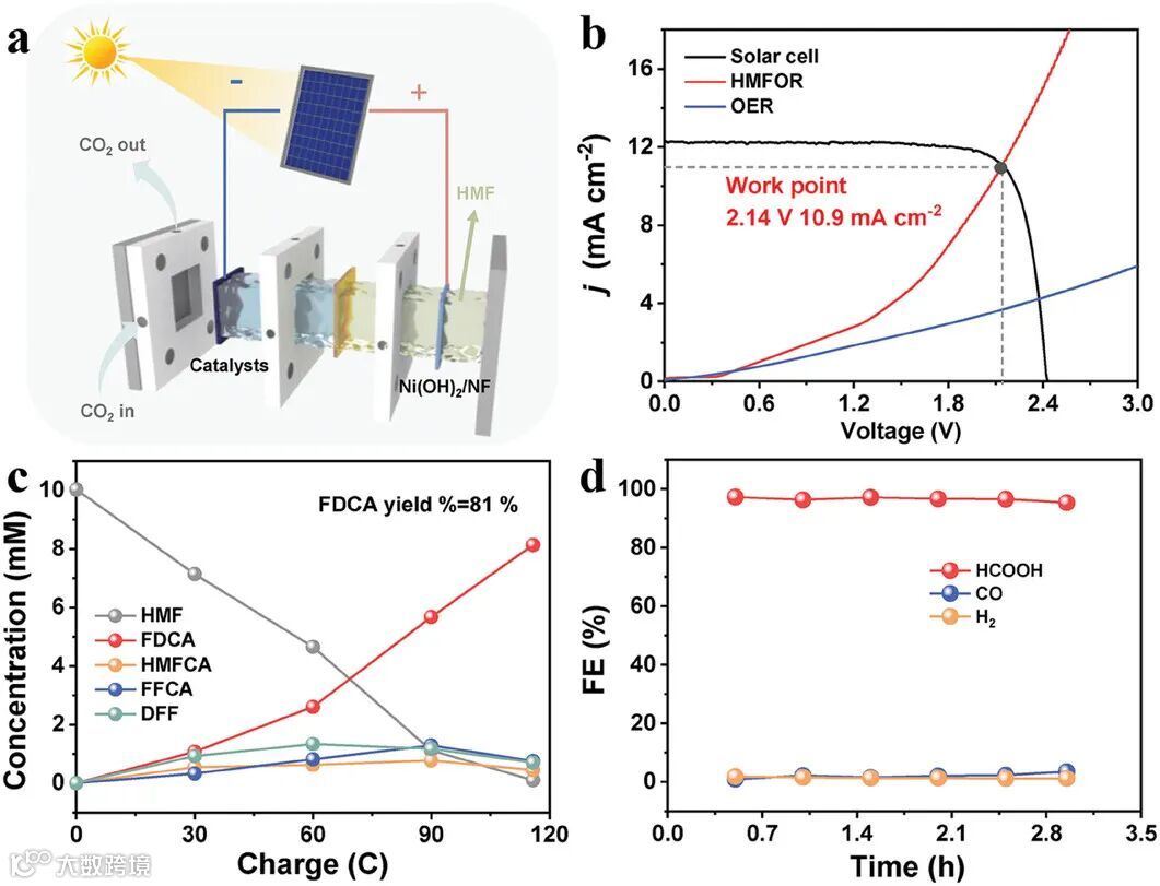 图6a展示了太阳能驱动的CO₂-HMF分裂装置的示意图。图6b为太阳能电池和电化学池的I-V曲线。图6c为氧化反应过程中HMF及其产物的浓度变化。图6d为BiSbInCdSn-O₄在CO₂-HMF系统中的甲酸法拉第效率。利用BiSbInCdSn-O₄作为CO₂RR阴极和Ni(OH)₂/NF作为糠醛氧化阳极的双电极电解池系统,实现了生物质的高附加值转化。该电解器由GaInP/GaAs/Ge太阳能电池驱动,无需外部偏压,运行在2.07 V和11.4 mA cm⁻²。长期稳定性测试表明,随着FDCA的主导生成,HMF逐渐消耗。当糠醛氧化与CO₂RR耦合时,太阳能电池驱动的系统展现了81%的FDCA产率和99%的HMF转化率。